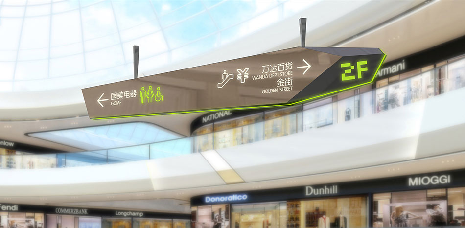 南寧萬達(dá)廣場的建筑及內(nèi)裝風(fēng)格,主要在追求新穎、個(gè)性化、主題化的表達(dá)模式。在此背景下,南寧萬達(dá)廣場的標(biāo)識設(shè)計(jì)主要汲取南寧邕江曲線的文化元素,通過奔放的有機(jī)曲線與未來科技感的結(jié)合,不僅達(dá)到前衛(wèi)的效果,又體現(xiàn)地方文化特色,突出了萬達(dá)廣場“綠色+有機(jī)”的發(fā)展模式。