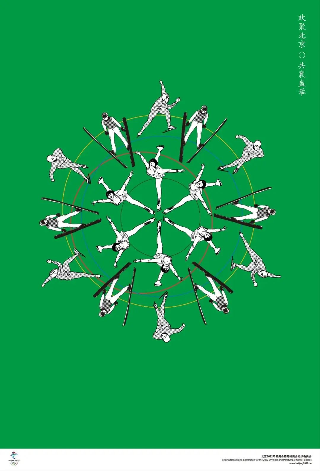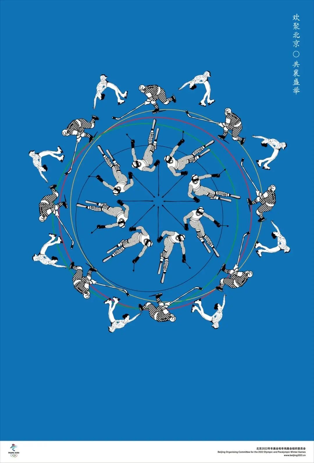 海報設(shè)計采用冬奧會經(jīng)典冰雪運動項目的連續(xù)動作組合形成形態(tài)各異的雪花造型,如:以花樣滑冰、冰球、速度滑冰和跳臺滑雪等造型作為基本視覺元素,組成冬季形態(tài)萬千的雪花,以奧林匹克五環(huán)套疊而成運動軌跡,并以五環(huán)色彩進行圖底的組合搭配,既展現(xiàn)冬奧運動健兒們的速度與激情,同時,圖像構(gòu)成又具有中國傳統(tǒng)特征,體現(xiàn)了奧林匹克精神與中國傳統(tǒng)文化藝術(shù)的完美結(jié)合。形式活潑,生動,色彩明快清新。