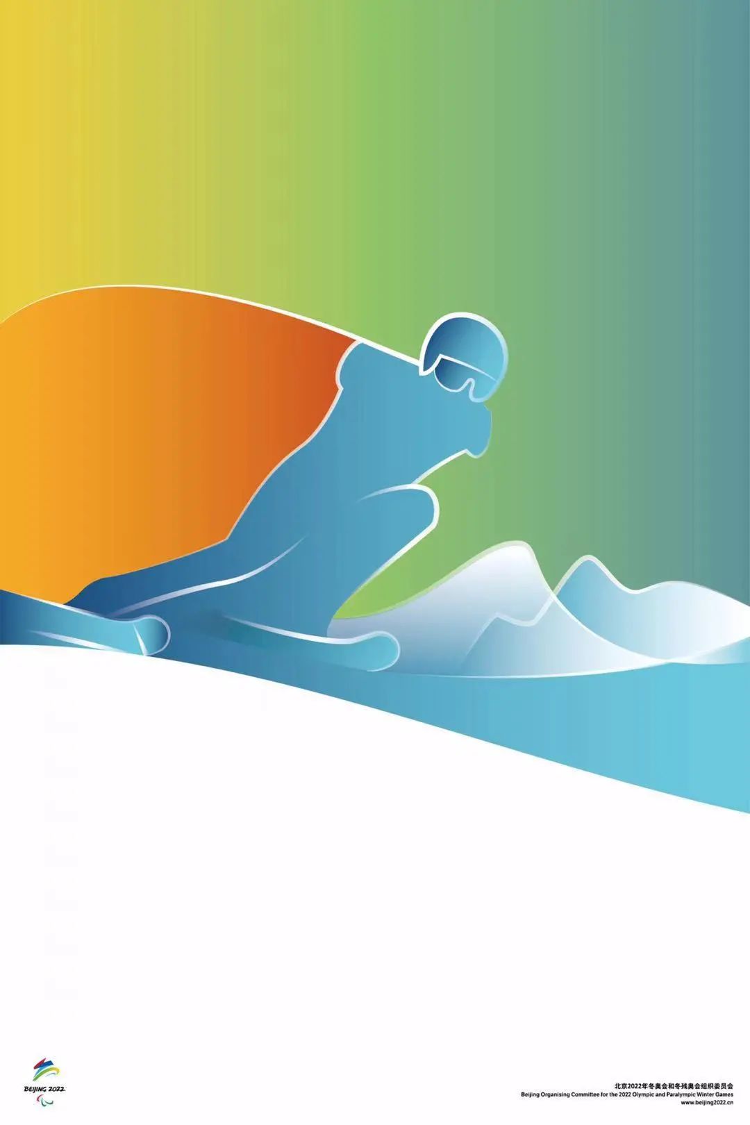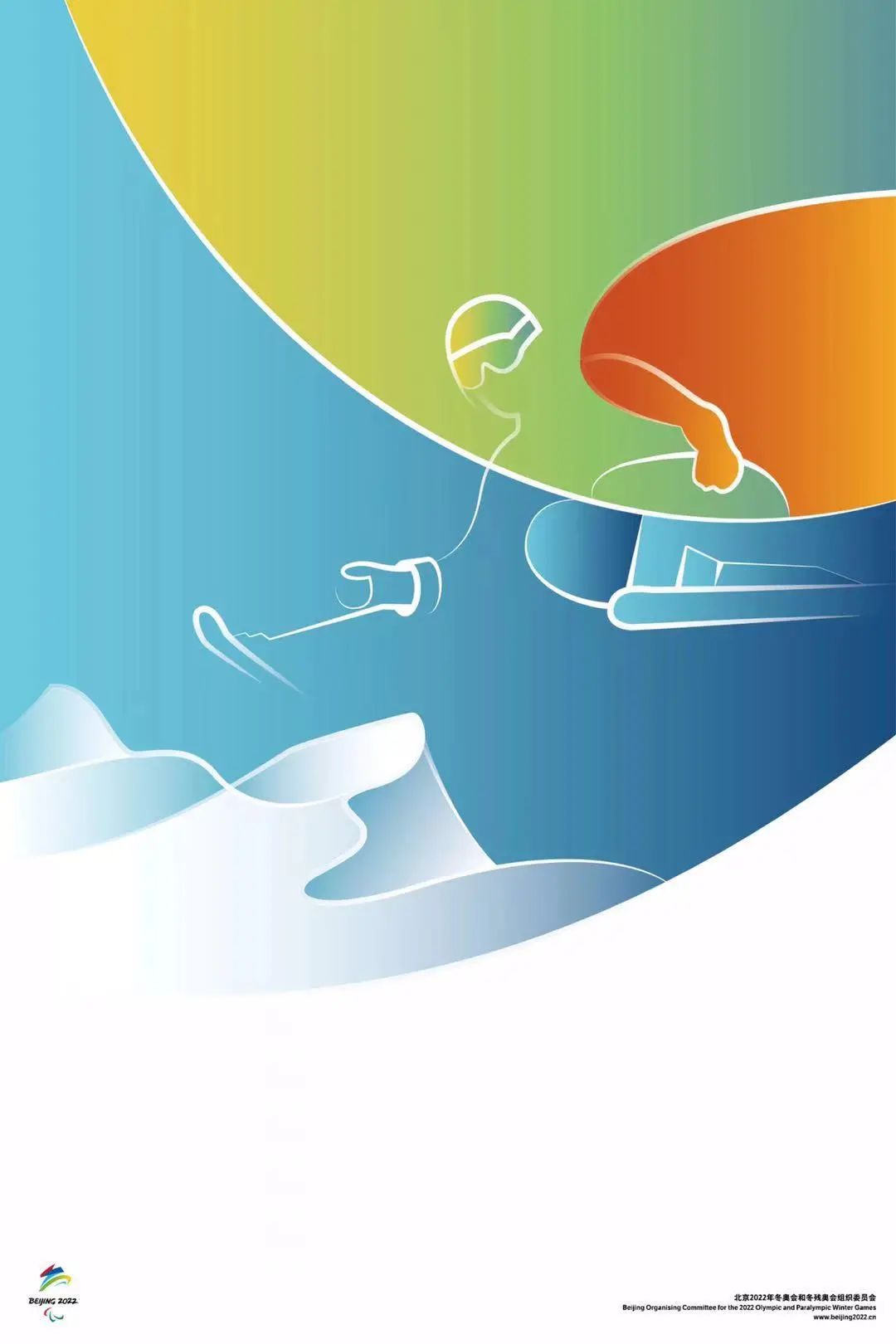 海報主旨于體現(xiàn)奧運精神中人與自然的和諧統(tǒng)一。主要通過三方面的對比手法實現(xiàn)。首先是尺度的對比:畫面中運動員的小比例關(guān)系一反海報設(shè)計中人物占主體的尺度安排手法,從而將人或者運動員轉(zhuǎn)化為了自然力量的一部分;其次是動靜、具象抽象的對比,抽象的背景圖形來自于冬奧會會徽的延展、是靜態(tài)的,具象的形象則來自于冬奧會賽場上運動員的剪影、是動態(tài)的,兩者相輔相成;最后是冰與雪的對比:其中冬奧海報體現(xiàn)的是雪的輕柔與飛揚,冬殘奧海報體現(xiàn)的是冰的通透與堅韌,兩者一起很好的傳遞了冬奧精神。